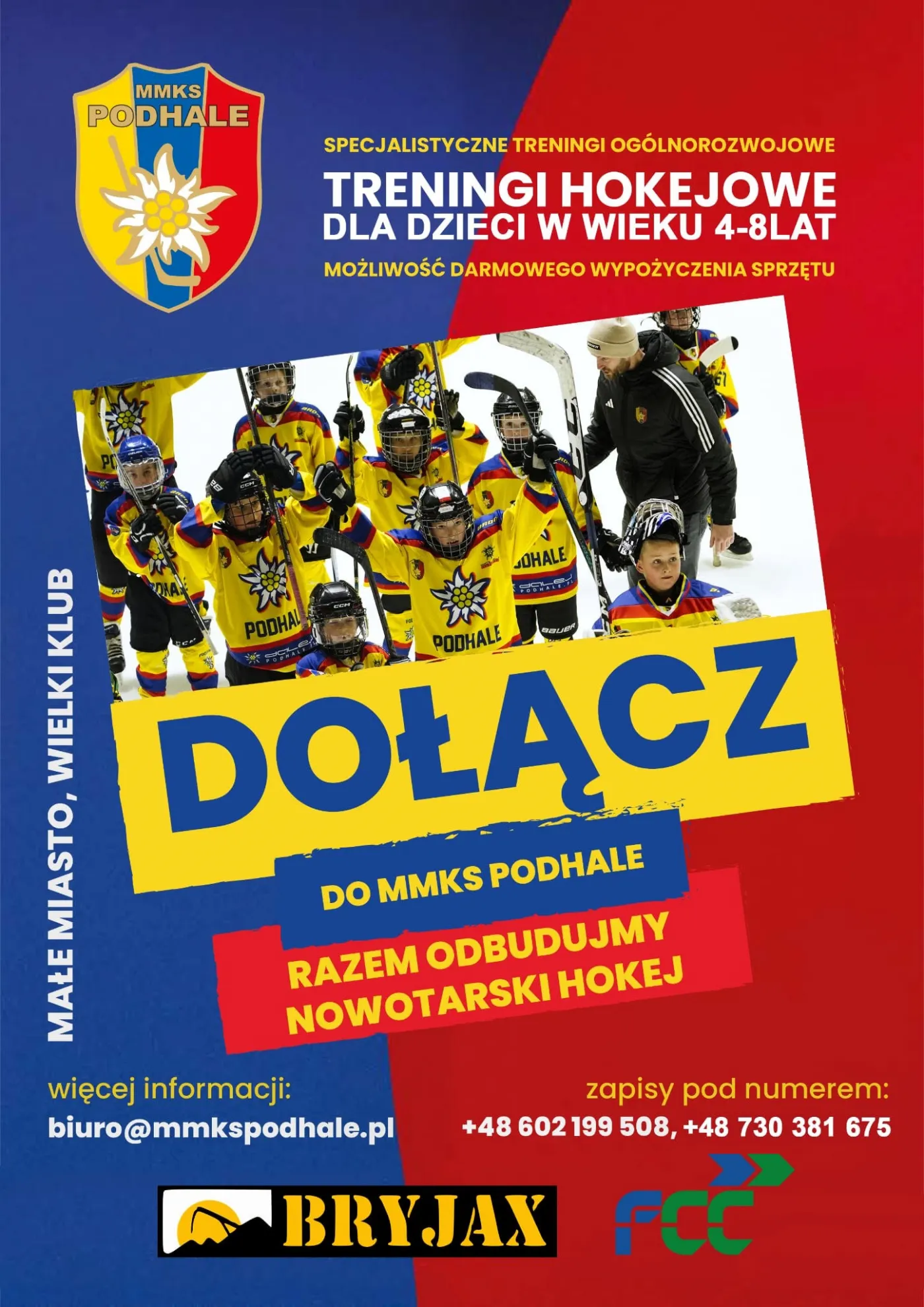 Serdecznie zapraszamy wszystkie dzieci (chłopców i dziewczynki) od 4 lat na treningi hokeja na lodzie. Istnieje możliwość wynajęcia sprzętu hokejowego dla najmłodszych zawodników.