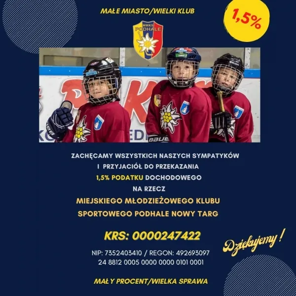 Nasz ukochany klub MMKS Podhale jako stowarzyszenie prowadzi statutową działalność Organizacji Pożytku Publicznego, co daje nam możliwość otrzymywania 1,5% podatku dochodowego od osób fizycznych. W związku z taką możliwością szczególnie zachęcamy ludzi o dobrych sercach, rodziców, kibiców hokejowego Podhala o inwestowanie w nasze dzieci, młodzież. Nawet najmniejsze pieniądze przekazane na szczytny cel jakim jest nasz klub wspomagają nasze dzieciaki i młodzież w inwestowanie w przyszłość sprawnego wysportowanego społeczeństwa. W przyszłość naszego miasta.