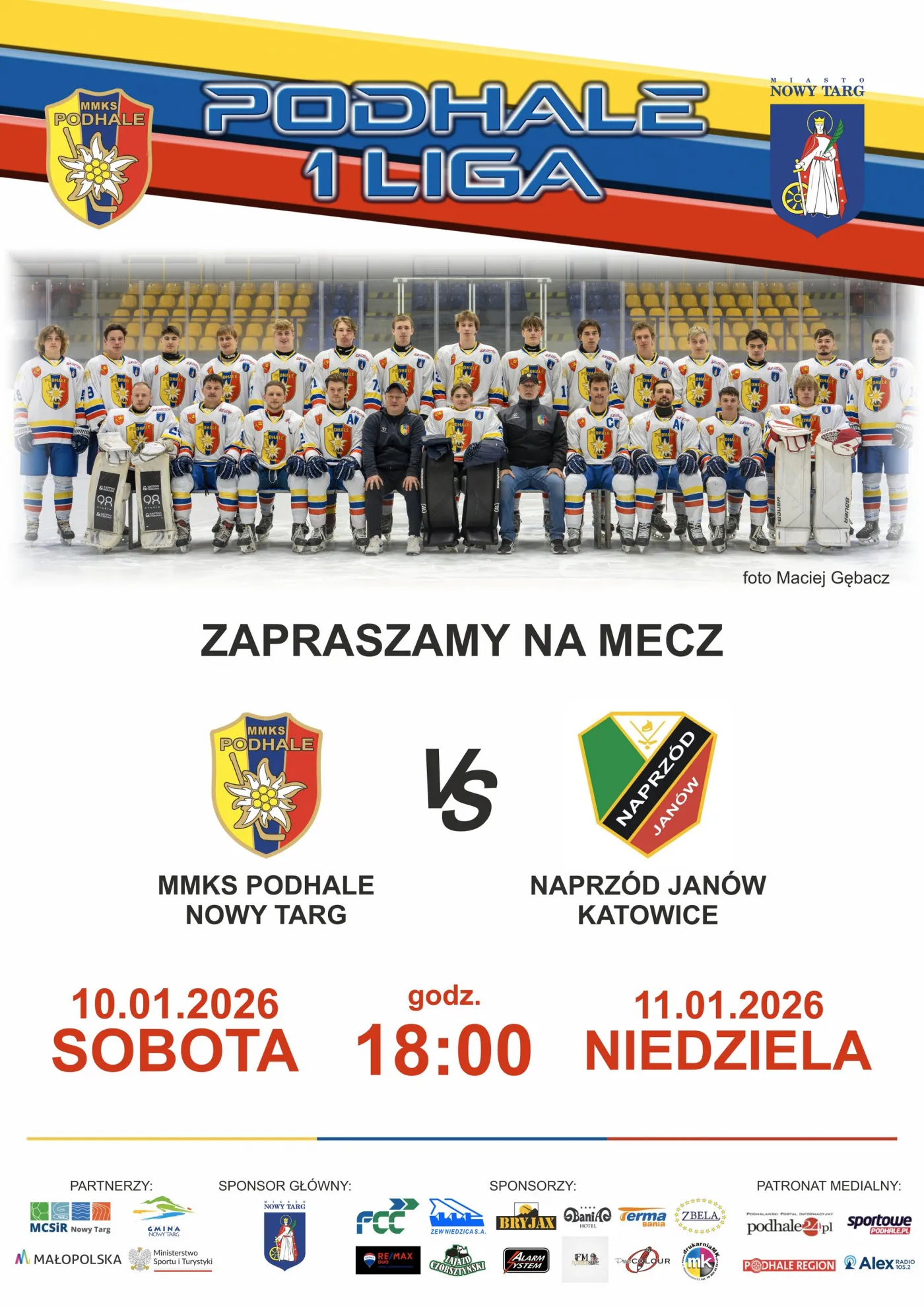 Zapraszamy na mecz! MMKS Podhale - Naprzód Janów 10 i 11 styczeń 2026r. godz.: 18:00 08 / 01 / 2026 Sponsor Główny Sponsorzy Partnerzy