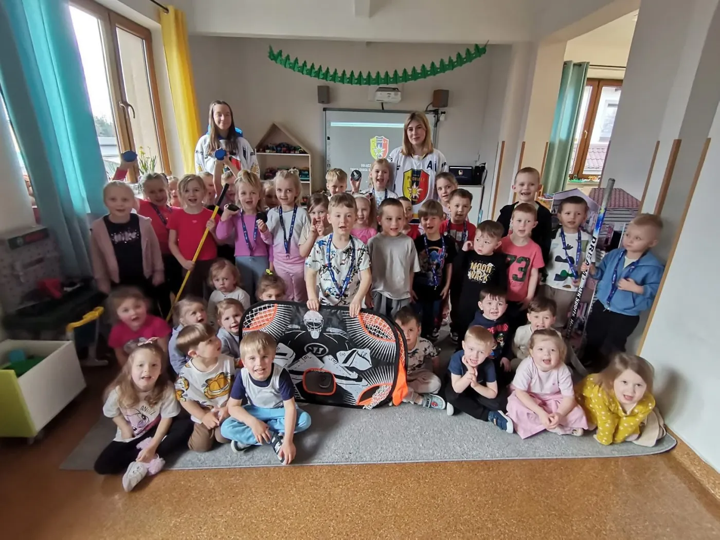 9 kwietnia nasze hokeistki miały wyjątkową okazję odwiedzić przedszkole ,,Magiczna Kraina” w Trutem. Podczas wizyty dzieci mogły nie tylko posłuchać o tym, jak wygląda gra w hokeja, ale także same spróbować swoich sił! Była okazja, by założyć elementy sprzętu, postrzelać do bramki i poczuć się jak prawdziwi hokeiści i hokeistki.