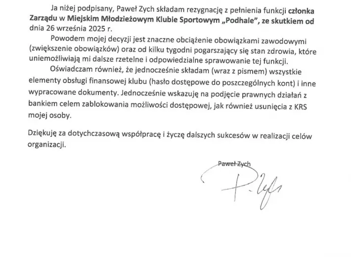 Zapraszamy do zapoznania się z treścią rezygnacji Pana Pawła Zycha.